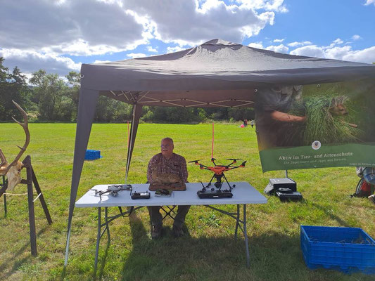 Der JV-Hubertus Gießen unterstütze das Jägerteam mit einer Abordnung der Kitzrettung und der Gruppe Lernort-Natur des Vereins. Klaus Tegtmeyer und Sebastian Hühn hatten ihre Drohnen unter einem Pavillon aufgebaut und Gerlinde Abel und Ralf Weber die Rollende Waldschule des Vereins.