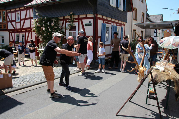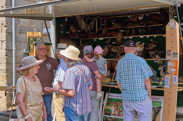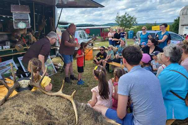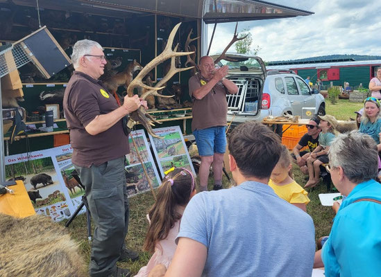 Auf großes Interesse stießen die diversen Hegemaßnahmen der Jägerschaft: beispielsweise Rebhuhn und Hasenzählung. Sehr erstaunt war eine Reihe von Besuchern, dass man an Hand des Zahnabschliffes das ungefähre Alter von Rehen abschätzen kann. Das Werfen von Gummiringen auf die Enden von 2 Rothirsch-Geweihen war für Groß und Klein ein Riesenspaß und sorgte für strahlende Gesichter und jede Menge Lacher.