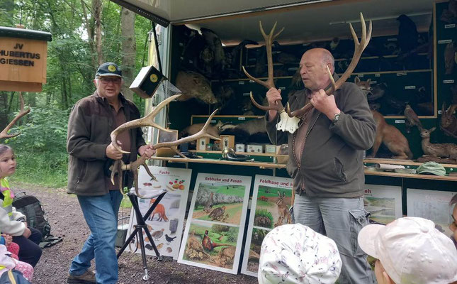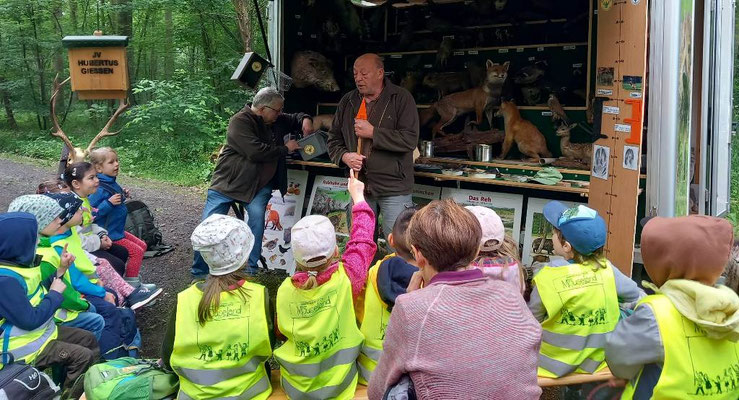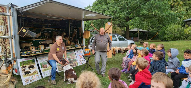 Bei ihrer Rückkehr erwartete die Kinder an der Jagdhütte eine weitere Überraschung, denn hier hatten die Waldpädagogen der Gruppe Lernort-Natur, Dieter Jüttemeier und Ralf Weber des JV-Hubertus Gießen die Rollende Waldschule aufgebaut.