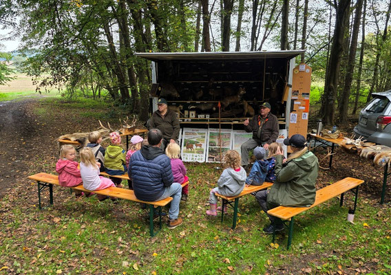 Kita Hausen am Montag den 08.09.2025. Die Kinder waren mit ihren 3 Betreuerinnen zur Albert-Schwarz Hütte gewandert, wo Dieter Jüttemeier und Ralf Weber die Rollende Waldschule des JV-Hubertus Gießen aufgebaut hatten. Schon bei ihrer Ankunft erregte die Rollende Waldschule mit ihren vielen Präparaten der heimischen Tierwelt die Neugier der Kinder.